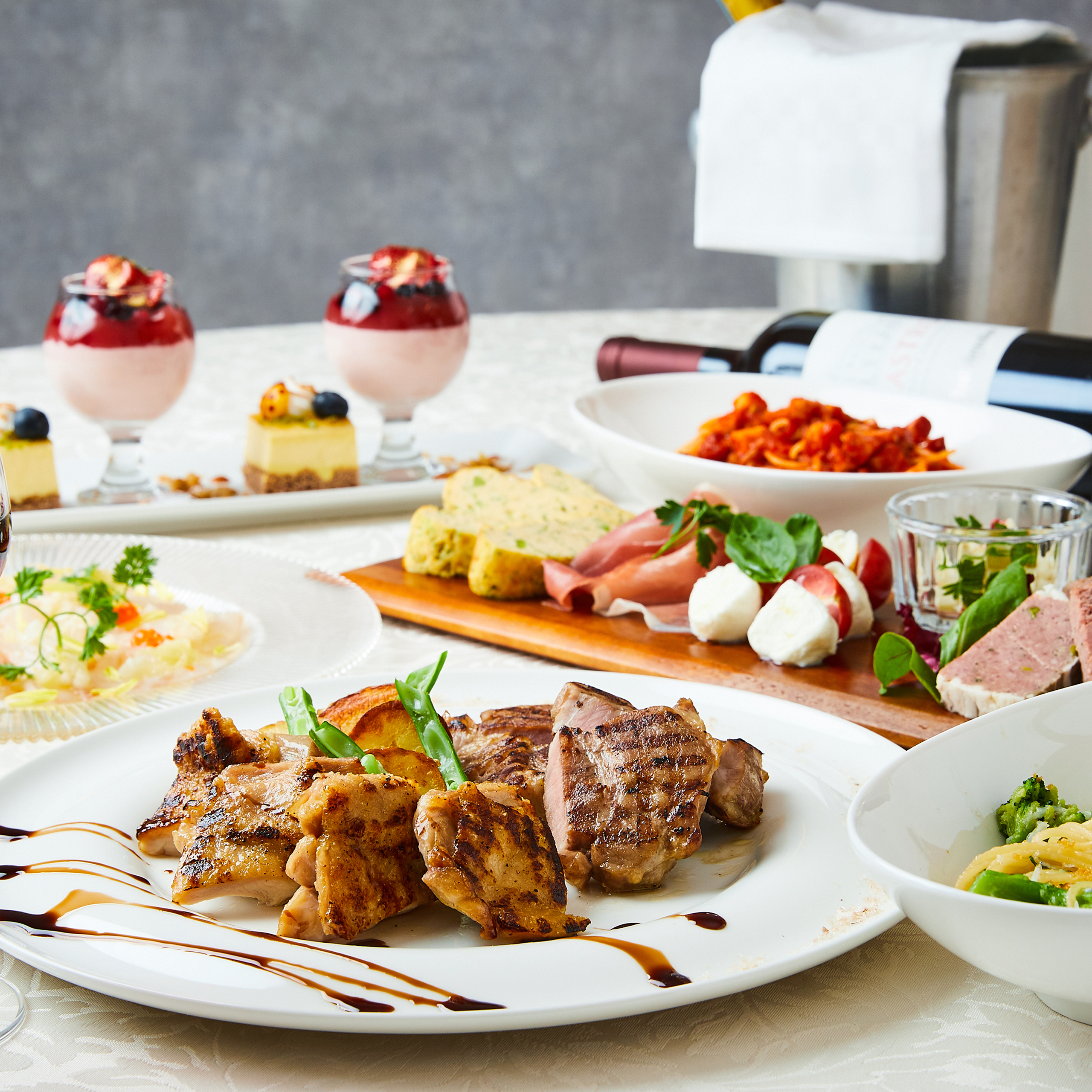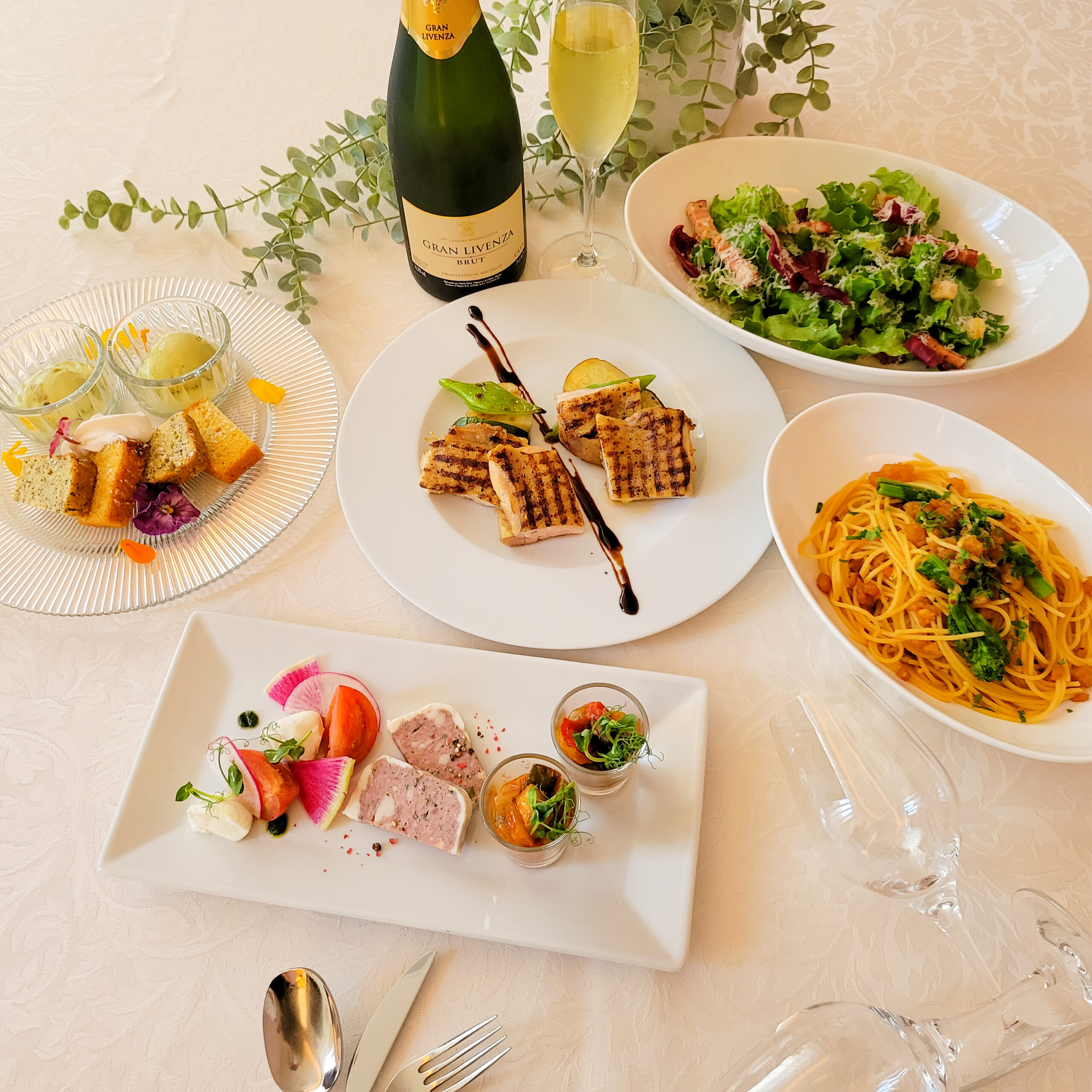 シェフおまかせパスタやお肉料理が味わえるコース全5品と2時間飲み放題がセットになったプラン。